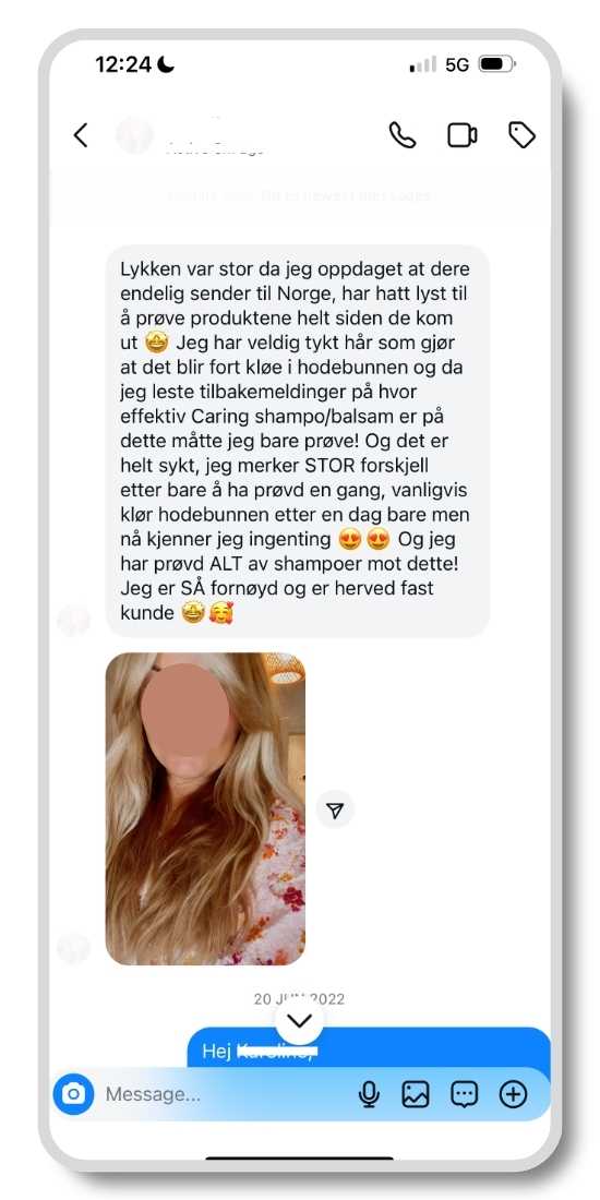 Massera in Caring Shampoo i hårbotten och skölj ur noggrant. Följ upp med Caring Conditioner och låt verka i 1-5 minuter innan du sköljer ur.